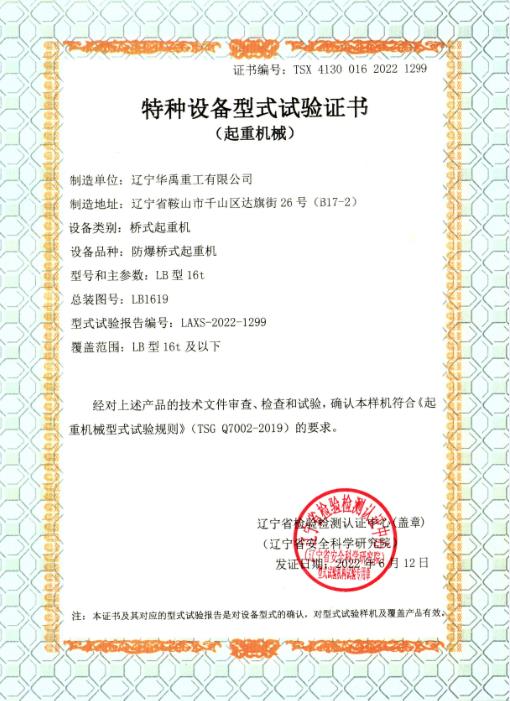 防爆双梁型式试验合格证